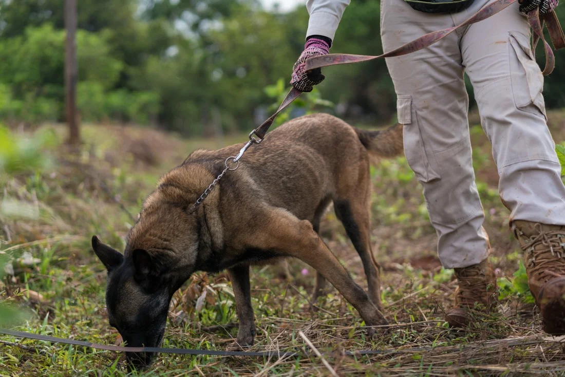 April 27, 2017 - Banlung (Cambodia). J-Liv, a Belgian shepherd explosive detection dog, waits for instruction from her handler Mao Neav. NPA has recently started using explosive detection dogs in their clearance missions as they are faster than metal detectors. It takes around a year to complete the training for the dogs and they’re instructed in Norwegian by the handlers. © Thomas Cristofoletti / Ruom